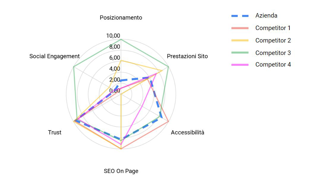 Il punteggio del posizionamento si basa sull’analisi del numero di visite mensili al sito provenienti dai motori di ricerca, per misurare l’attrattiva e la visibilità reale della presenza online rispetto ai competitor.